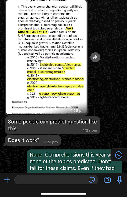 So, what’s my take-away? If any student of this tuition business followed the advice and devoted an unfair amount of time to specific topics over others, the student would have been worse off in the exam than another who just applied good study habits and revised the core course content. That hardly sounds like good advice to give to paying customers. To any tutors out there, don’t try to play the meta – even if you have honest intentions, focus on giving students useful study skills, not gimmicks.